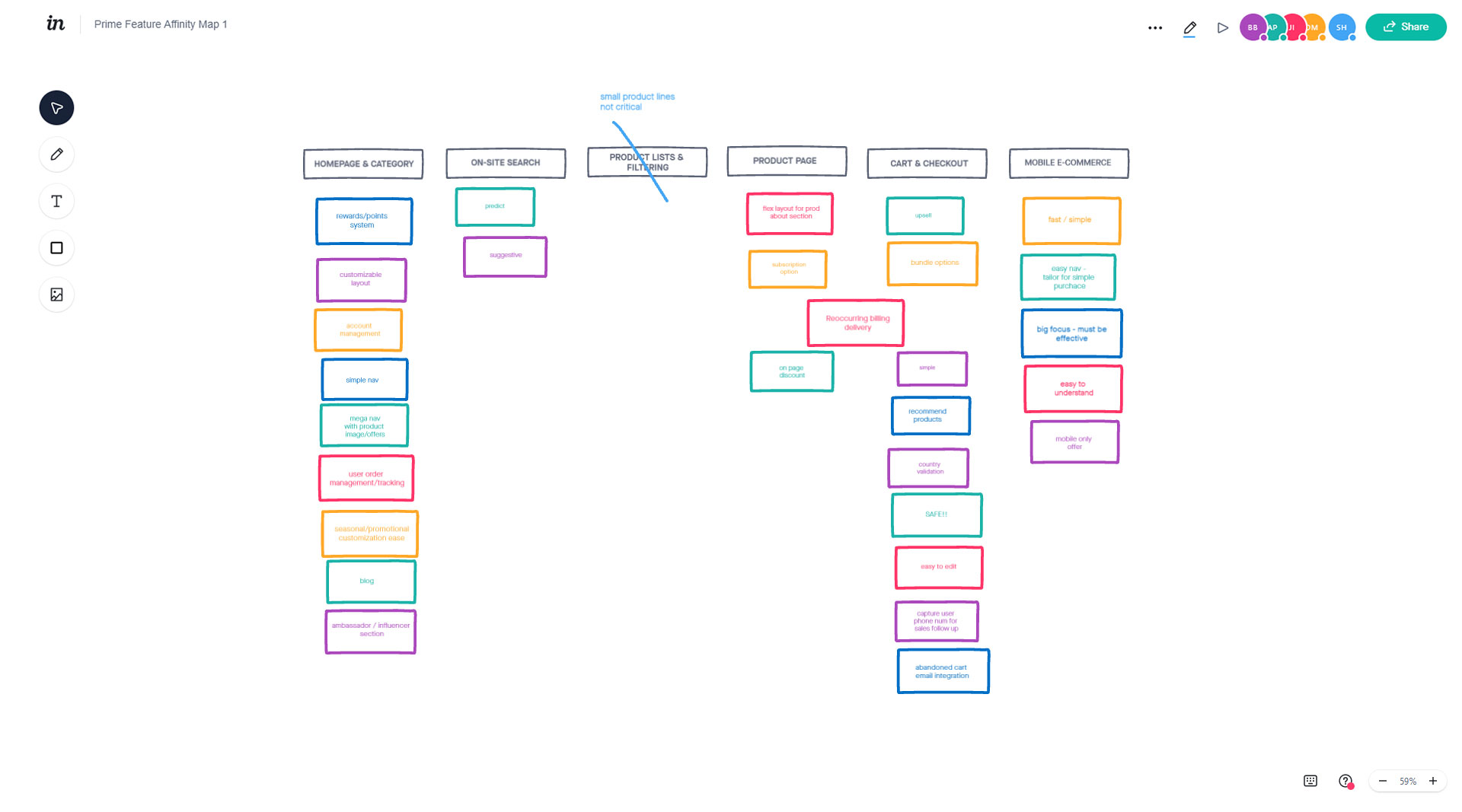 Being a remotely distributed team and at the beginning of a large project. I decided to get the key stake holders together for a brainstorming sesh around the core elements of an ecomm site; features we wanted to focus on in each section, elements we wanted to develop, etc. I utilized freehand in the inVision app to allow all the stakeholders to create and add feature cards under the main site categories at once while we were on a slack call together. This resulted in great discussions, getting everyone on the same page in terms of design and development direction.